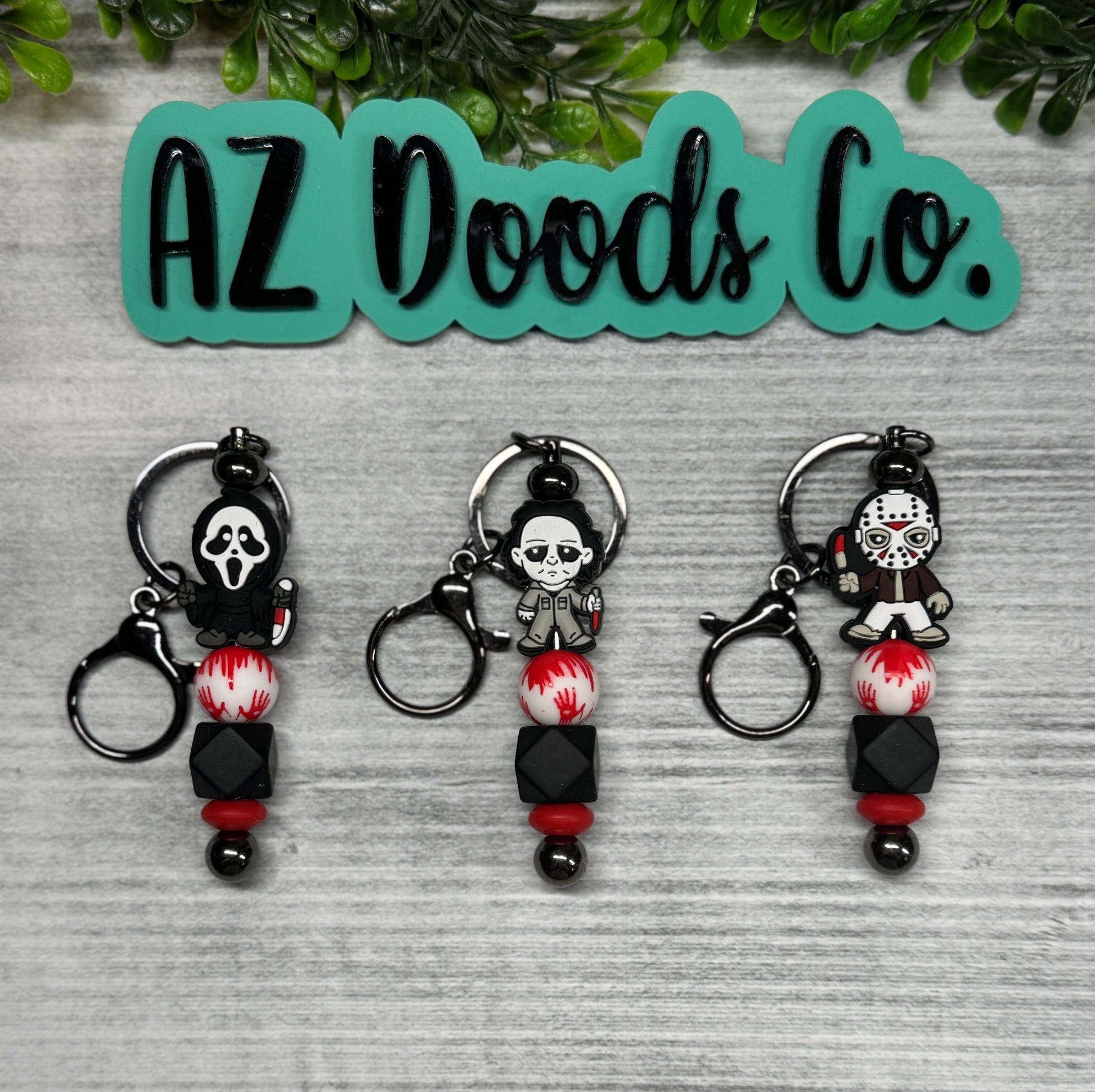 - 🔑 Keychains – featuring Ghostface, Michael Myers, and Jason, paired with bold beads that give a chilling touch to your keys, bags, or lanyards.